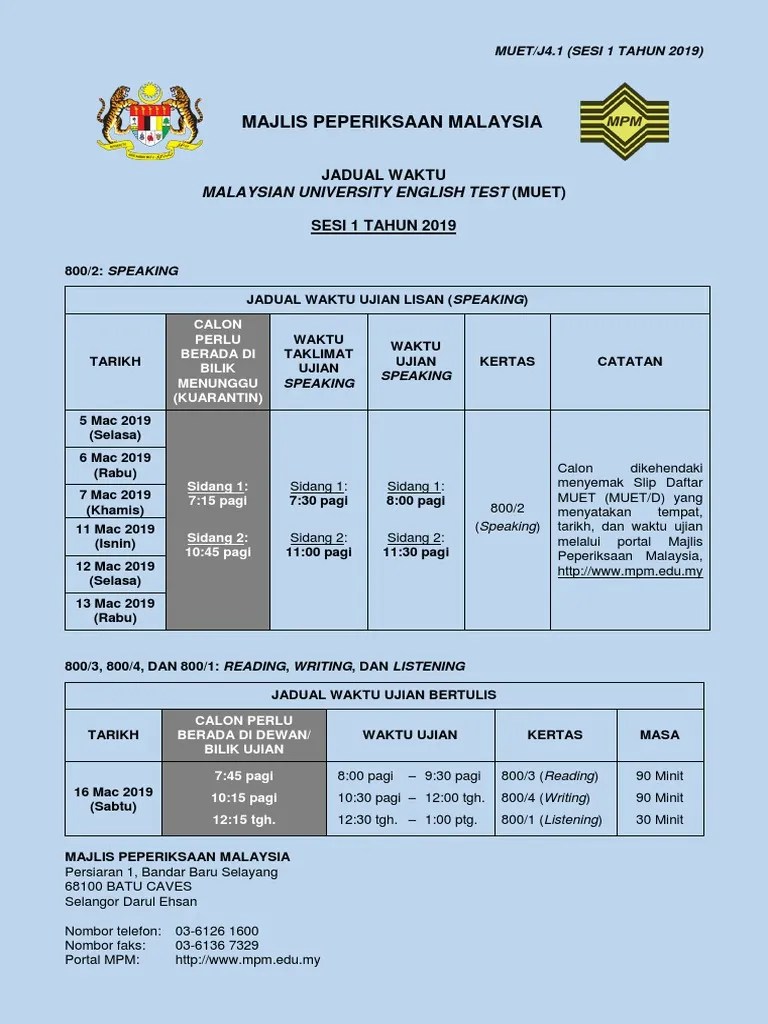 Jadual Waktu Muet On Demand Mod Upuonline 2019 2020 Facebook from lookaside.fbsbx.com Untuk paparan jadual yang lebih jelas, sila muat turun di majlis peperiksaan malaysia. 16 mac 2019 29 jun 2019 2 november 2019 (reading, writing, dan listening). Tarikh penting peperiksaan muet 2021. Seperti sedia maklum, muet adalah ujian bagi mengukur pencapaian dan kemahiran berbahasa inggeris pelajar untuk mengikuti ijazah. Sebagai latihan dan gambaran tes seleksi nanti. Peperiksaan muet ini wajib diambil oleh mereka yang ingin melanjutkan pengajian di peringkat ijazah pertama (degree) di institusi pengajian tinggi awam (ipta) tempatan. *caj penghantaran adalah rm 0.15 manakala caj penerimaan adalah rm 0.20. Ujian speaking adalah pada 18 hingga 26 jun 2019 manakala ujian bagi listening, reading dan writing diadakan pada 29 jun 2019.
